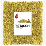 - Granella di pistacchi: la granella di pistacchi può essere impiegata nella preparazione di piatti sia dolci che salati, sia come guarnizione che come ingrediente fondamentale. È noto come i pistacchi siano immancabili protagonisti della tradizione culinaria del sud Italia e delle isole: la granella viene impiegata sia nella guarnizione dei cannoli siciliani che per arricchire un gustoso piatto di gnocchetti sardi con tocchetti di pesce spada, per creare la crosta di ottimo un trancio di tonno fresco, all’interno della farcitura degli arancini o come parte del condimento di una pizza napoletana (mozzarella fior di latte, ricotta di bufala, olio EVO, basilico e granella di pistacchi). Quello che magari è meno noto è che i pistacchi entrano anche nella preparazione di dolci tradizionali in molte parti del mondo ne è un esempio il Baklava, un dolce tipico sia della cucina mediorientale che balcanica a base di pasta fillo, miele e granella di pistacchi (alcune versioni prevedono anche l’utilizzo di granella di mandorle e noci). La granella di pistacchi è ottima anche per la preparazione del pesto di pistacchi fatto in casa, basta frullarla con un frullatore ad immersione assieme a Grana Padano grattugiato, basilico, aglio, olio, sale e pepe a piacere per ottenere un gustoso condimento per un piatto di pasta. La granella di pistacchi crudi Frutta e Bacche è anche un’ottima fonte di fosforo, che contribuisce al mantenimento di ossa e denti normali, rame, che contribuisce al normale trasporto di ferro nell’organismo, e vitamina B6 coinvolta nel mantenimento della normale funzione psicologica.